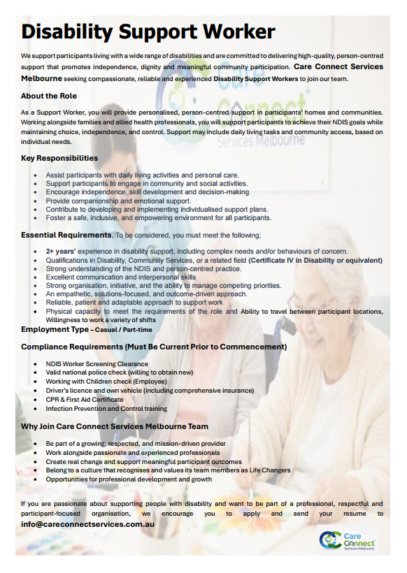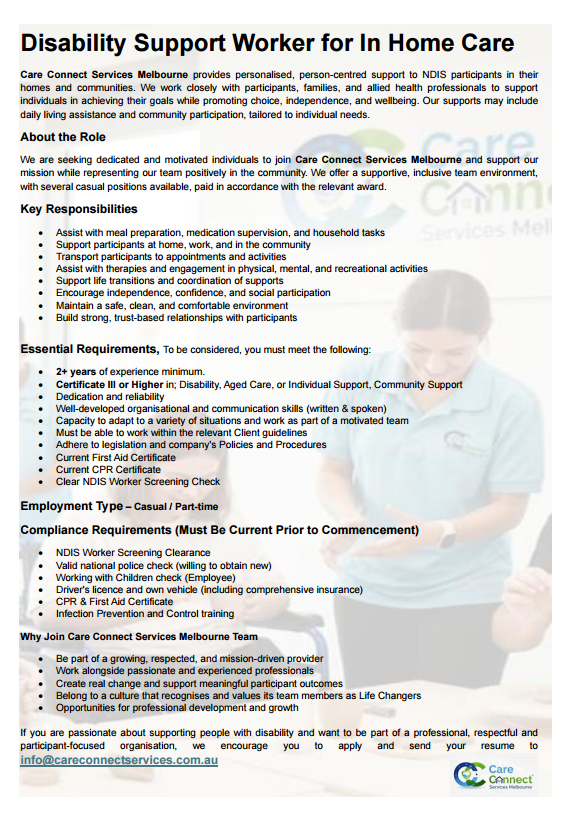 Send your resume to info@careconnectmelbourne.com.